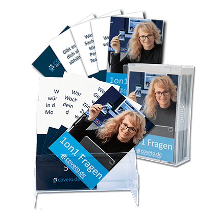 Ganz einfach wird es mit unseren coveto 1on1 Kartenset. Du kannst Dir die 1on1 Fragenbox mit 76 Fragen inklusive Checkliste direkt hier bestellen.