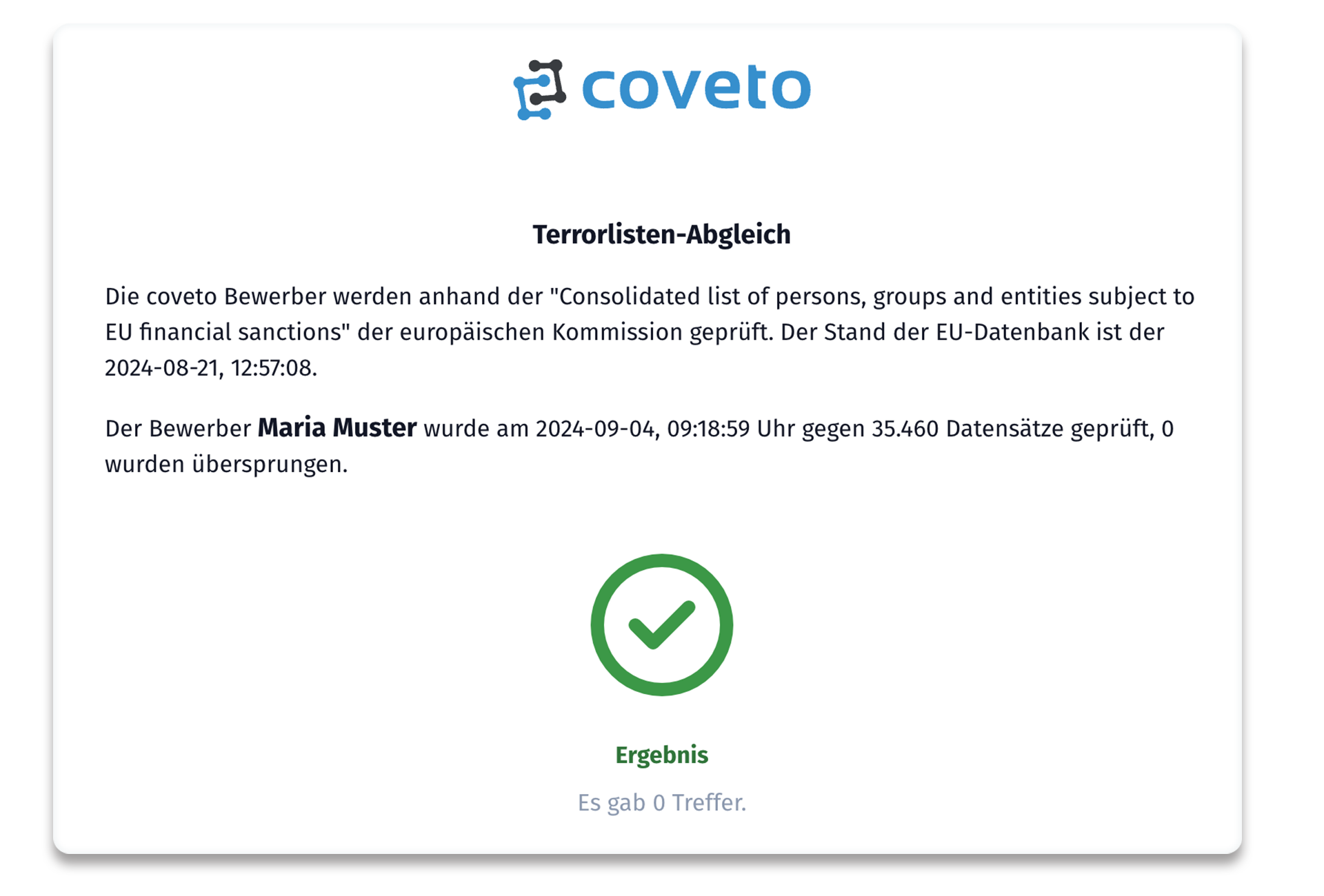 Diese gesetzlich vorgeschriebene Überprüfung von Personen, mit denen Unternehmer geschäftliche Verbindungen eingehen übernimmt in coveto die Funktion "Terrorliste". Sie gleicht die Vornamen, Zweitnamen und Nachnamen der Personen mit dem Vornamen, Nachname und gegebenenfalls Zweitnamen mit der sogenannten Antiterrorismusliste ab.
