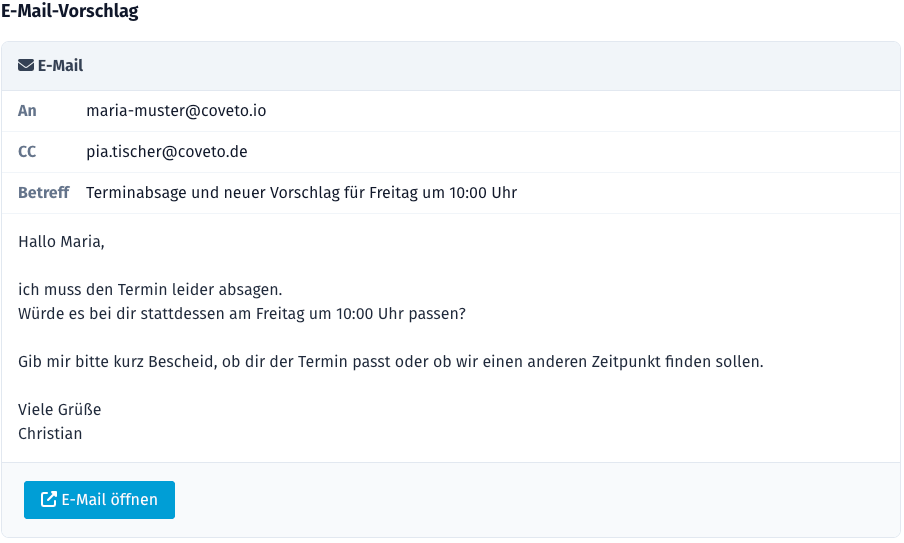 Wenn der KI-Chat eine E-Mail vorschlägt, erscheint dafür ein eigenes Element im Chat. Ein Klick auf „E-Mail öffnen" übernimmt den Vorschlag in Ihr E-Mail-Programm. Falls der E-Mail-Import eingerichtet ist, wird die gesendete E-Mail automatisch in coveto abgelegt. Versendet wird die E-Mail nicht automatisch — Sie können sie vor dem Versand noch prüfen und anpassen.