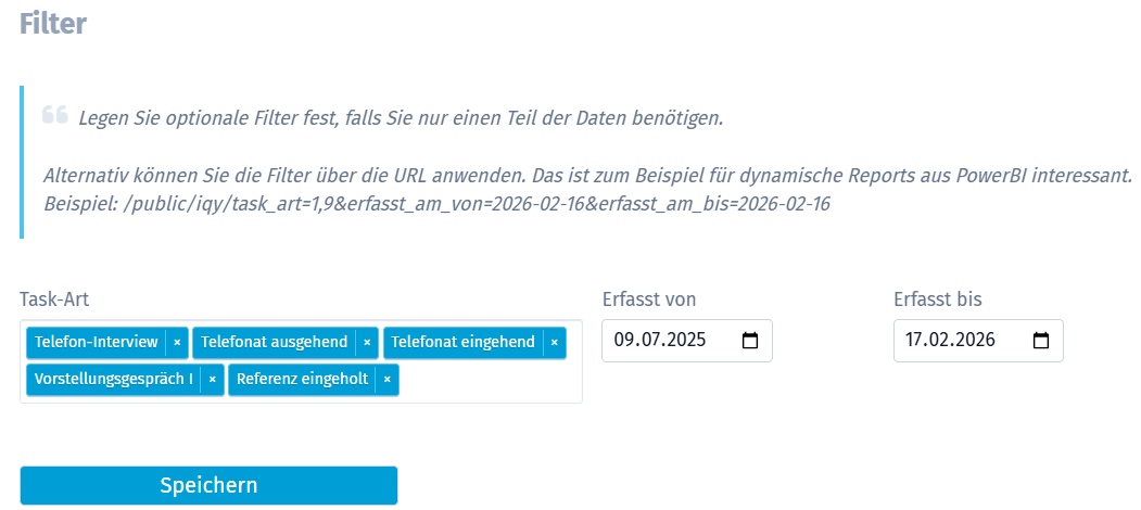 Exporte über die BI-Schnittstelle können nun gefiltert werden. Statt immer alle Daten eines Bereichs zu exportieren, lassen sich z. B. Taskarten und Zeiträume gezielt auswählen. Das reduziert Ladezeiten und verbessert die Performance bei großen Datenmengen.