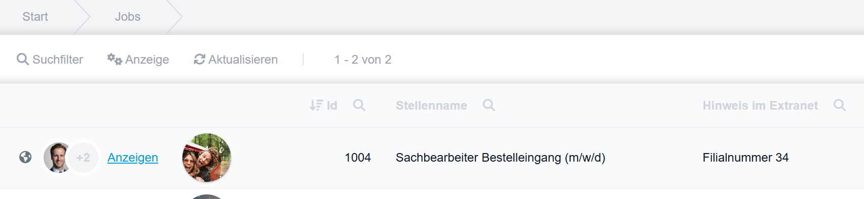 Neu: Informationen, die im internen Stellenname hinterlegt wurden (z. B. Filialnummern oder interne Hinweise), können im Feld „Hinweis im Entscheider-Extranet“ eingetragen werden. Dieses Feld lässt sich nun von Entscheidern optional als Spalte einblenden, wenn diese die tabellarische Ansicht benutzen.