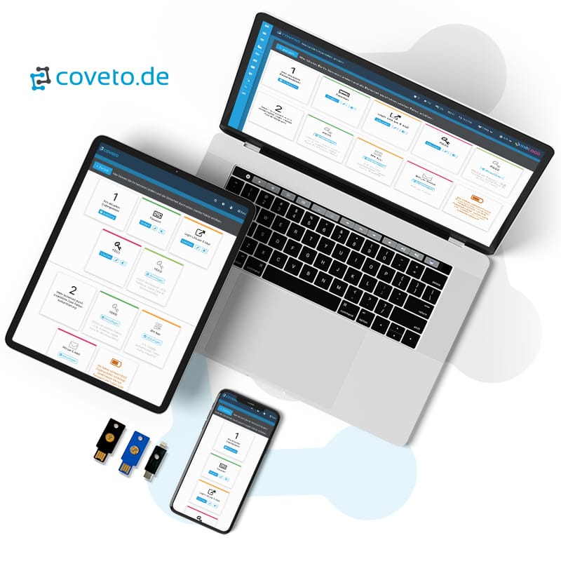 Mit ihrem Sicherheitsschlüssel - im PC/Smartphone integriert oder extern - können Sie sich sicher in coveto ohne Passwort anmelden. Alternativ können sie ihren FIDO2 Sicherheitsschlüssel auch als zweiten Faktor einrichten. Zu den kompatiblen Geräten zählen unter anderem: