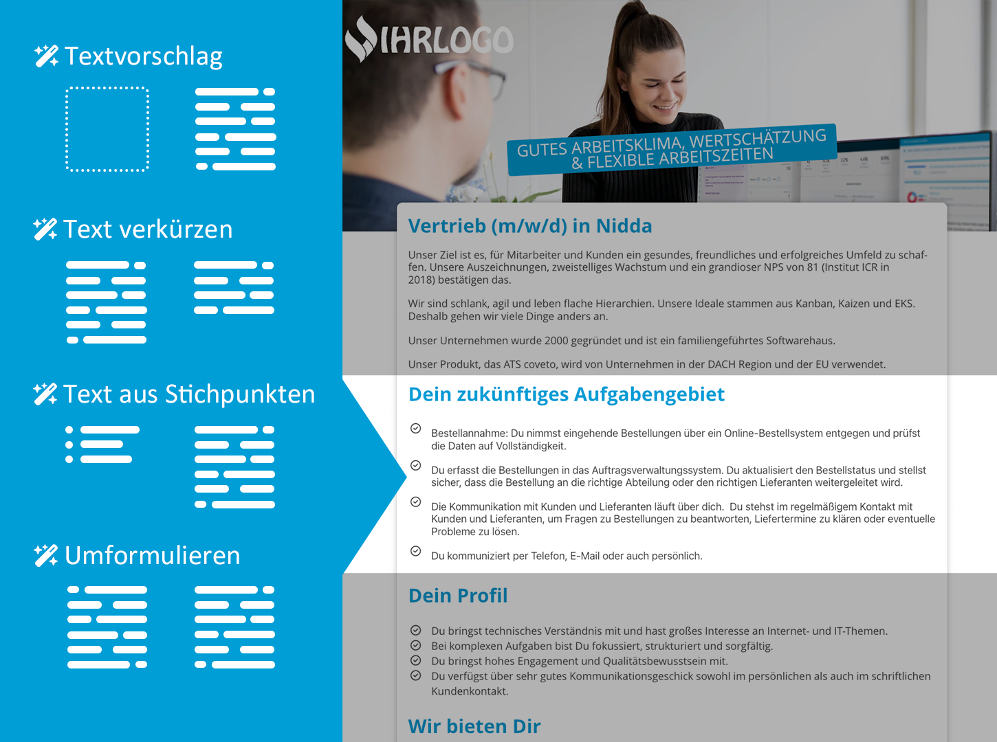 Management summary: Mit dem KI-Editor für Stellenanzeigen erstellst und optimierst du Jobangebote in Minuten – zielgruppengenau, im Corporate Design und mit maximaler Reichweite.